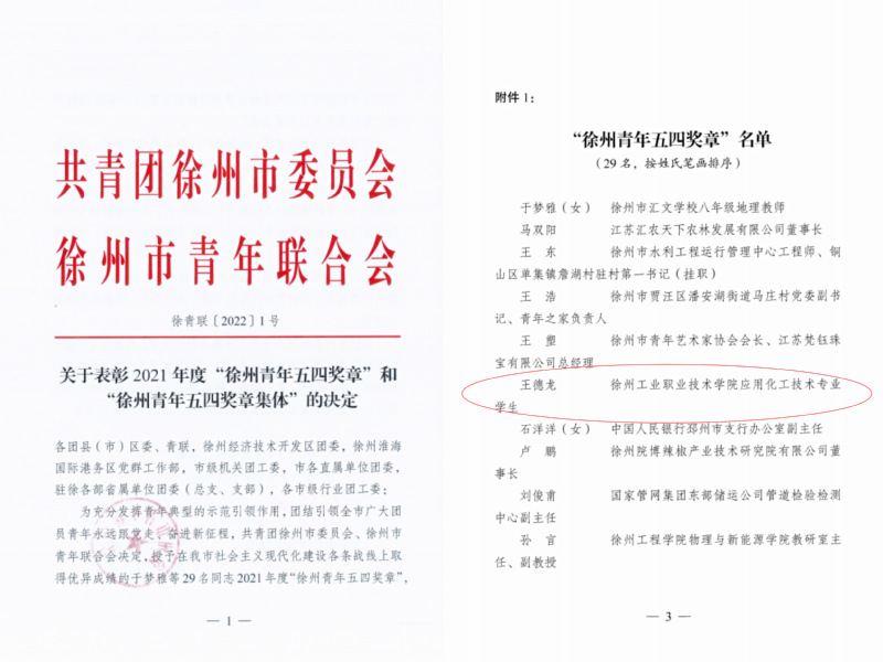 近日,由共青团徐州市委员会、徐州市青年联合会决定,授予在我市社会主义现代化建设各条战线上取得优异成绩的29名同志2021年度“徐州青年五四奖章”,授予15个集体2021年度“徐州青年五四奖章集体”。我校青年王德龙荣获“徐州青年五四奖章”,这是唯一获此殊荣的在徐学生。