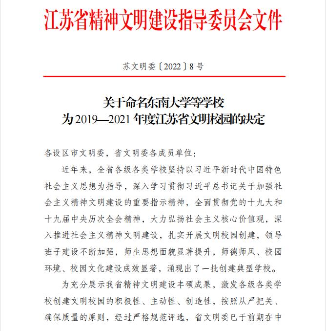 近日,江苏省精神文明建设指导委员会印发《关于命名东南大学等学校为2019-2021年度江苏省文明校园的决定》(苏文明委〔2022〕8号),我校被授予“江苏省文明校园”荣誉称号。