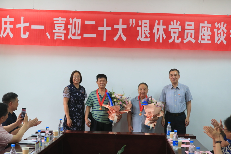 座谈会上,祝木伟书记、刘莹院长代表校党委、行政为光荣在党50年的夏友忠、林振华两位同志颁发了纪念章,献上了鲜花。
