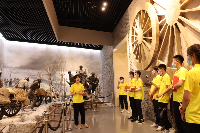 在双拥展览馆,实践团团长、“青马工程”学员、校团委学生兼职副书记马兆杰现场讲述了“人民的胜利”主题微团课,解开淮海战役的“胜利密码”,让实践团成员获得一次沉浸式的团课学习。