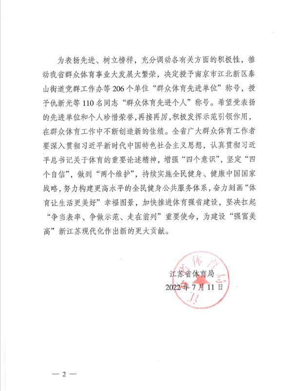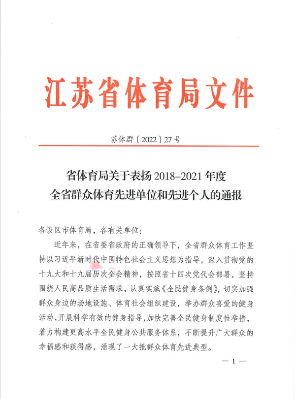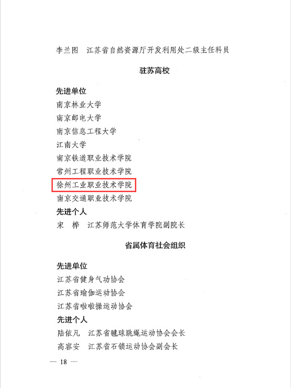 近日,江苏省体育局对2018-2021年度全省群众体育先进单位和个人进行了通报表扬,我校被授予“2018-2021年度江苏省群众体育先进单位”荣誉称号。据悉,共206家单位被授予“群众体育先进单位”荣誉称号,驻苏高校共有4所本科院校4所专科院校获此殊荣。