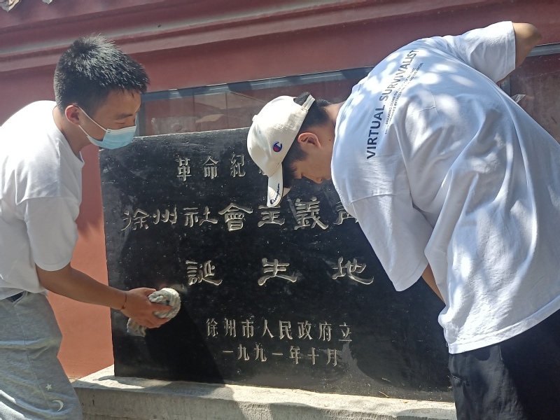 践行劳动教育,用传统文化涵养劳动精神。戏马台是徐州现存最早的古迹之一。进院门,东为楚室生春院,西为秋风戏马院,团队队员们在讲解员的带领下,通过观看视频、图片、图表、文字和聆听现场讲解的方式深刻了解了项羽的生平事迹。随后,队员们用提前准备好的抹布、扫帚、垃圾袋等劳动工具开始义务劳动,他们擦拭戏马台标志碑和展柜玻璃、清理庭院绿化区域的杂草、打扫参观区的地面卫生,队员们尽职尽责,充分践行了“勤俭、奋斗、创新、奉献”的劳动精神。学生党员姜旭瑞表示:“本次劳动教育实践活动不仅学习和弘扬了中华文化,还增强了劳动意识,提高了奉献过程中的自我认可度。”