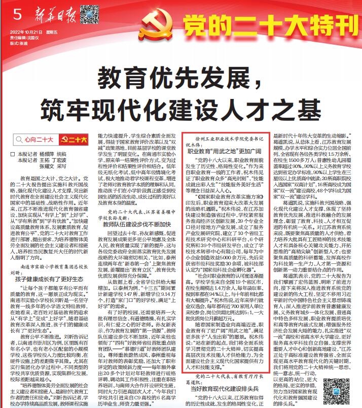 10月21日,《新华日报》党的二十大特刊第5版刊发了《教育优先发展,筑牢现代化建设人才之基》,我校党委书记祝木伟接受了采访。