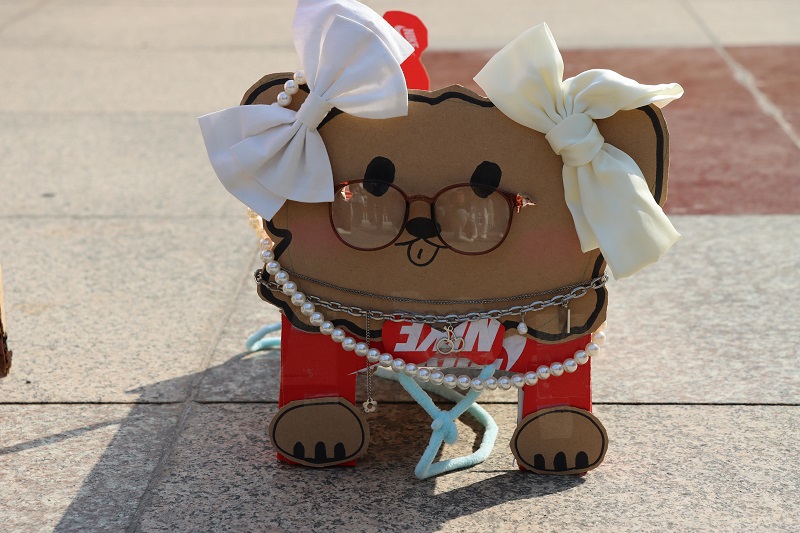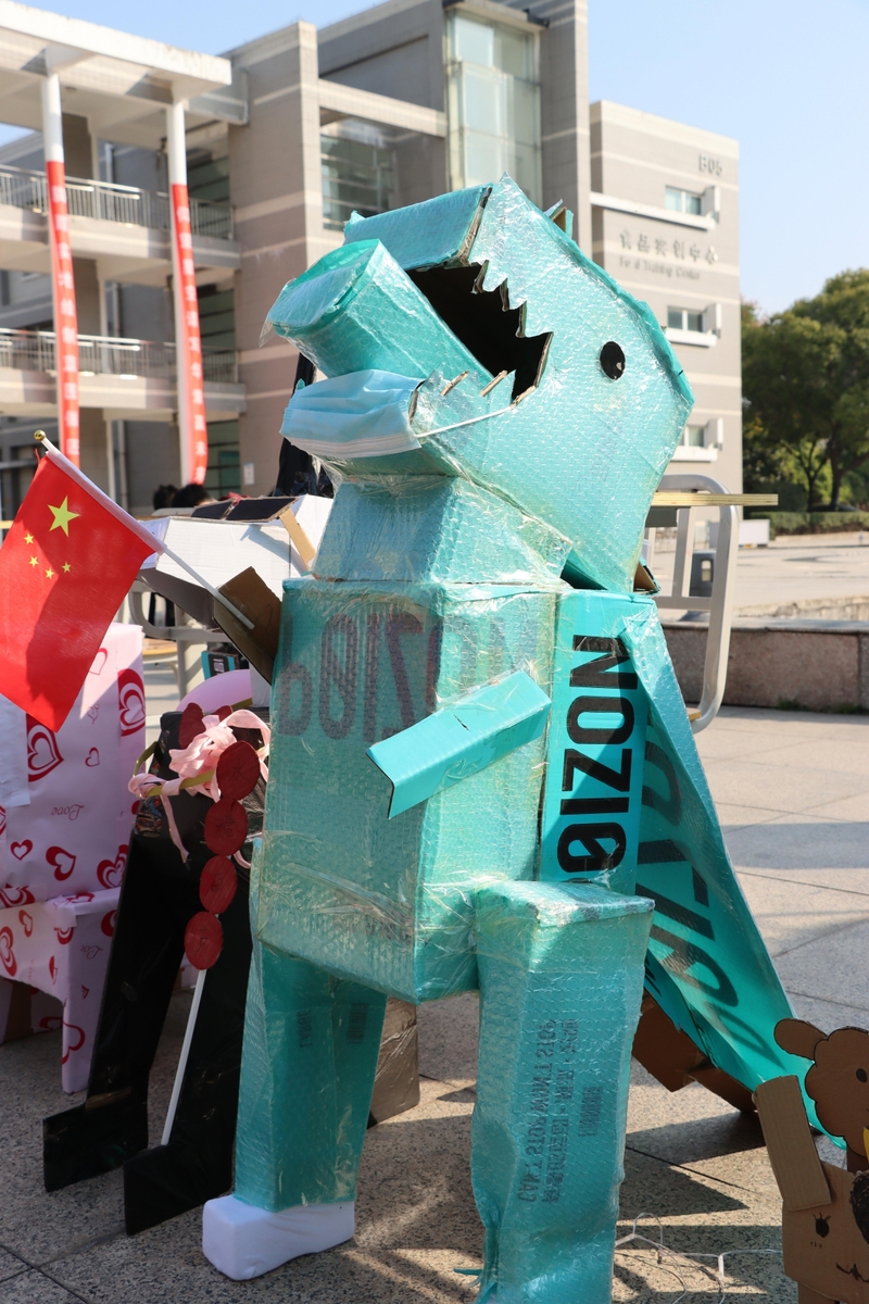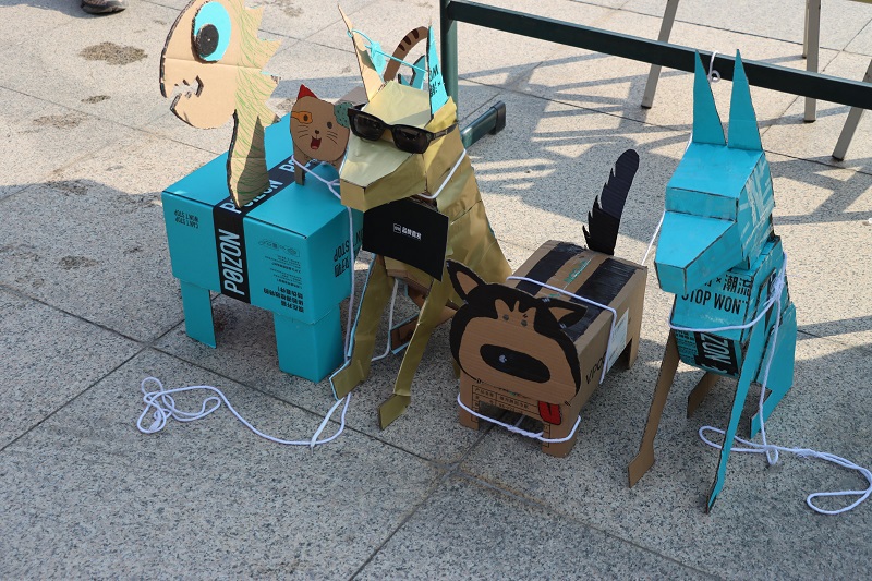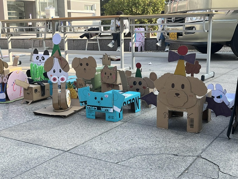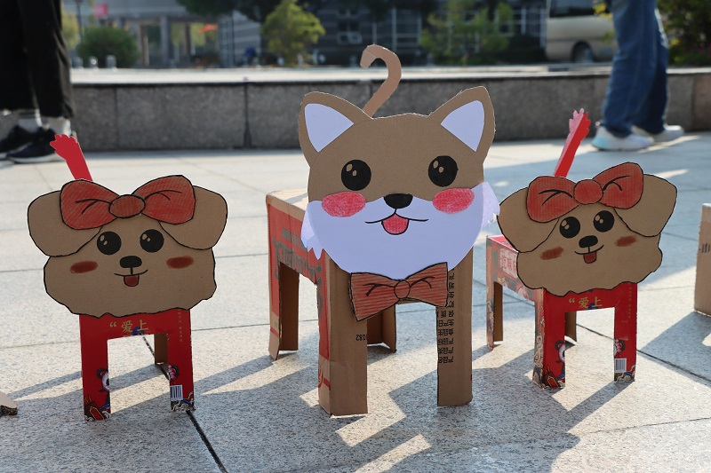 活动吸引了大批同学加入其中。经前期宣传,共有180名选手报名参赛。比赛开始后,选手被分为67支参赛队,每队3-6人。活动主持人介绍完活动规则后,各参赛队领取了活动主办方统一提供的制作材料,并在队长的带领下明确分工、团结协作,他们有的构思、有的裁纸、有的彩绘、有的拼接。不到一小时的时间,一个个构思巧妙、制作精良的萌宠展现在观众面前,有呆萌可爱的小羊、霸气十足的小狗、活灵活现的猫咪、一身正气的恐龙……活动结束后,每个参赛队“牵”出自己的“萌宠”,对其进行全方位的展示,并阐释了作品的创作理念及制作过程中体现的工匠精神。评委根据各队在产品创意、精美程度、理念阐释等方面的整体表现进行了现场打分。