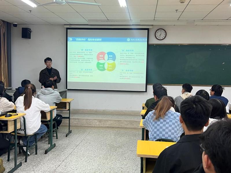 为增强学生对于“四维评价体系”的认同感,确保每一名同学知晓并了解“四维评价体系”,激励学生在学业生涯有目标、有方向、有动力。信息工程学院于10月26-27日召开了“四维评价体系”主题班会,各班主任为学生详细讲解了“四维评价体系”的构成、每个模块的得分标准并教会学生如何查询个人分数,帮助学生及时了解自己的不足和未来努力方向,班会课上同学们认真学习、积极提问、互动频繁。通过此次主题班会课,帮助学生更加细致全面地了解“四维评价体系”,引导学生在未来的学习生活中以“四维评价体系”作为参考,不断进步,合理规划大学生活,促进个人全面发展。