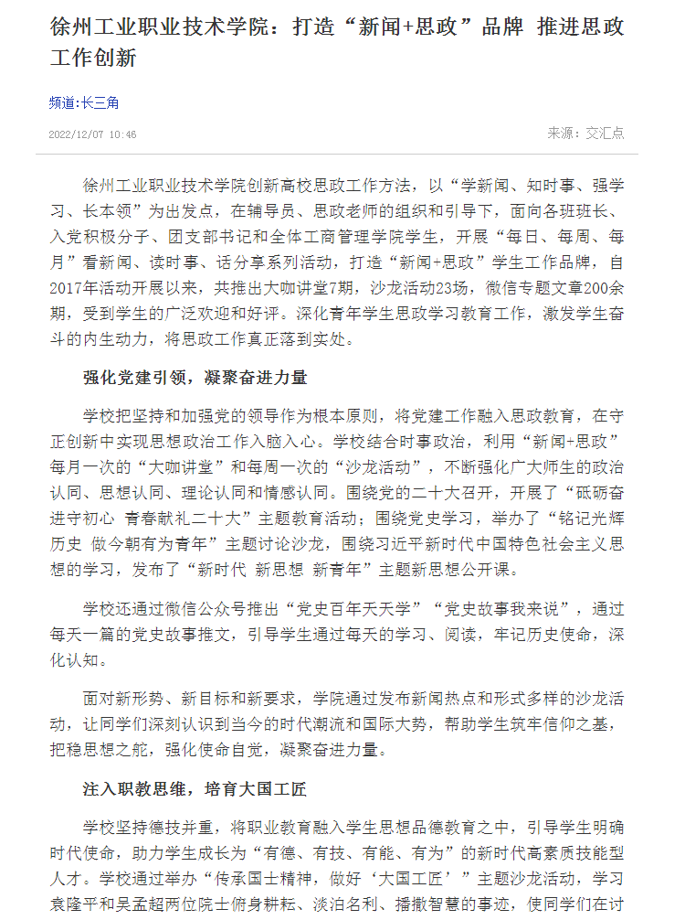 徐州工业职业技术学院创新高校思政工作方法,以“学新闻、知时事、强学习、长本领”为出发点,在辅导员、思政老师的组织和引导下,面向各班班长、入党积极分子、团支部书记和全体工商管理学院学生,开展“每日、每周、每月”看新闻、读时事、话分享系列活动,打造“新闻+思政”学生工作品牌,自2017年活动开展以来,共推出大咖讲堂7期,沙龙活动23场,微信专题文章200余期,受到学生的广泛欢迎和好评。深化青年学生思政学习教育工作,激发学生奋斗的内生动力,将思政工作真正落到实处。