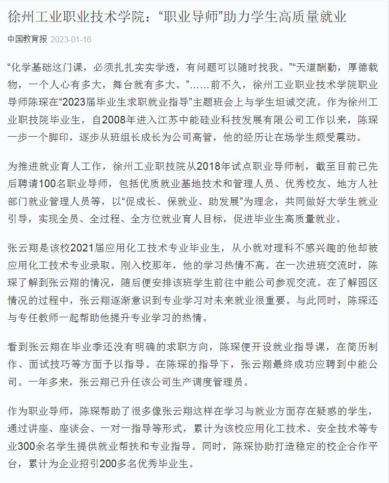 “化学基础这门课,必须扎扎实实学透,有问题可以随时找我。”“天道酬勤,厚德载物,一个人心有多大,舞台就有多大。”……近日,徐州工业职业技术学院的职业导师陈琛在“2023届毕业生求职就业指导”主题班会上与学生坦诚交流。作为徐州工业职技院毕业生,自2008年进入江苏中能硅业科技发展有限公司工作以来,陈琛一步一个脚印,逐步从班组长成长为公司高管。他的经历,让在场学生获益良多。