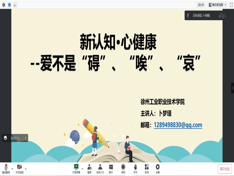 精准赋能,启发思考。学院邀请徐州工程学院心理健康教师卜梦瑾于2月20日开展“新认知·新健康—爱不是碍、唉、哀”讲座,主要讲述恋爱心理的发展阶段,恋爱期间出现的问题和解决方式,爱人的能力提升等,向学生宣传恋爱心理学知识,同时给心理委员和心理信息员进行专题培训,强化信息员队伍建设,在学生中树立积极向上的风气。