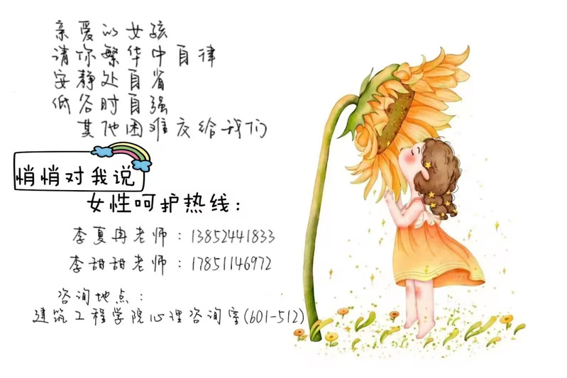 搭建热线,呵护成长。由我院两位女性辅导员牵头,开通了“悄悄对我说”女性呵护热线,旨在为女生们提供一个倾诉学习压力、成长困顿、恋爱交友和生活挫折等问题的渠道。在活动当天,我院志愿者们把经过精心设计、内含呵护热线的明信片送给参与活动的女生,并告诉女生们要热情阳光、勇敢坚毅,在这个世界上熠熠生辉,绽放属于自己的美丽。如果遇到困难,请“悄悄对我说”……