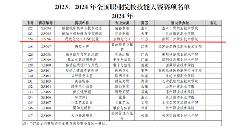 近日教育部发布《教育部关于举办2023年全国职业院校技能大赛的通知》(教职成函〔2023〕6号),我校首次获得全国职业院校技能大赛承办权,江苏省仅有四所高职院校获得2023、2024年全国职业院校技能大赛承办权。根据全国职业院校技能大赛执行委员会发布的《关于开展2023、2024年全国职业院校技能大赛赛区申报工作的通知》文件要求,我校快速响应、周密组织申报工作,成功获得全国职业院校技能大赛2024年现代化化工HSE技能赛项承办权。