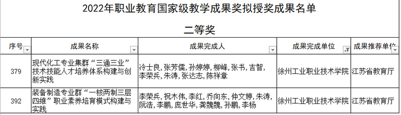 我校李荣兵教授、党委书记祝木伟研究员等主持的《装备制造专业群“一核两制三层四维”职业素养培育模式构建与实践》,冷士良教授、副院长张芳儒副研究员等主持的《现代化工专业集群“三通三业”技术技能人才培养体系构建与创新实践》两个研究项目双双获得二等奖,这是我校继2018年职业教育国家级教学成果奖获两项二等奖后再获此荣,也为我校下一轮双高遴选积累了核心条件。
