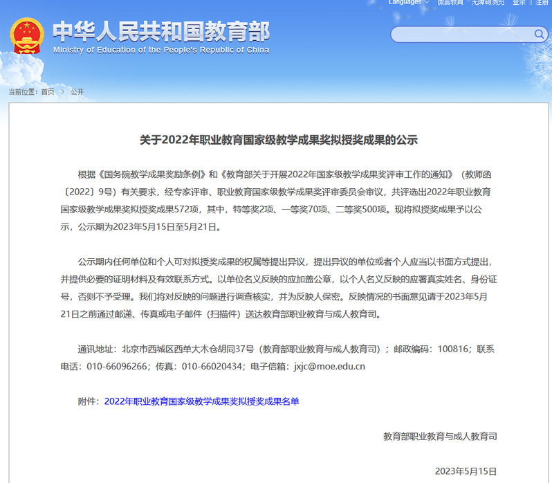5月15日,教育部网站发布2022年职业教育国家级教学成果奖拟授奖成果评审结果,共评选出特等奖2项、一等奖70项、二等奖500项。