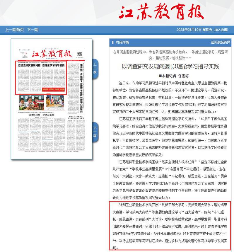 徐州工业职业技术学院开展“党员干部大学习、党员现场大研学、理论成果大宣讲、学习成果大竞技”等主题教育理论学习“四大活动”,组织“牢记嘱托、感恩奋进、走在前列”大讨论,以学校高质量党建、高质量发展、职业本科创建为专题开展研讨,以线上线下结合等形式展示研讨成果。线上交流依托学校智慧党建App学习交流平台,及时分享研讨成果;线下交流以学校干部讲堂为平台,举行主题教育学习研讨汇报会,通过多种方式强化理论学习指导学校发展实践。