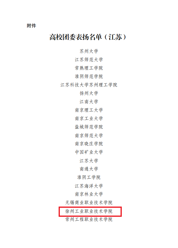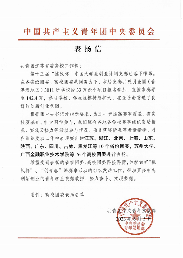 近日,团中央对在第十三届“挑战杯”中国大学生创业计划竞赛组织发动工作中表现突出的 10 个省份团委和 76个高校团委进行表扬。我校获通报表扬单位,江苏省仅6所职业院校获此殊荣。