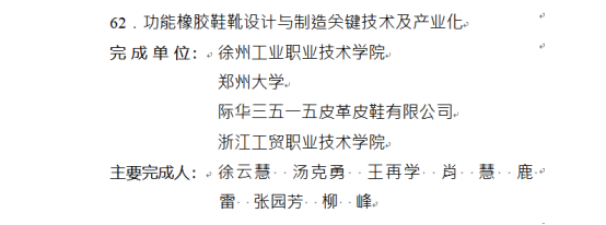 近日,江苏省人民政府发布了关于《省政府关于2022年度江苏省科学技术奖励的决定》,我校徐云慧教授主持的“功能橡胶鞋靴设计与制造关键技术及产业化”项目荣获2022年度江苏省科学技术奖三等奖,这是我校第4次获得省部级科技进步奖。