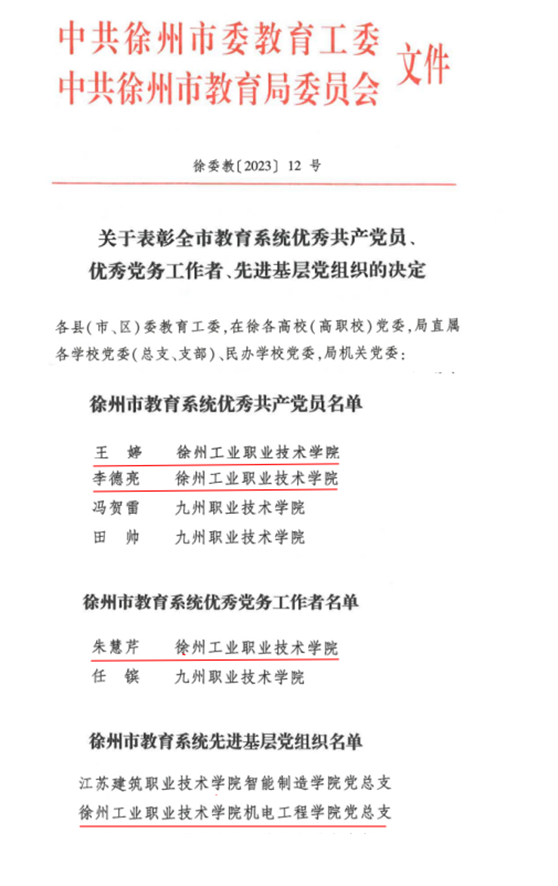近日,中共徐州市委教育工委、中共徐州市教育局委员会下发《关于表彰全市教育系统优秀共产党员、优秀党务工作者、先进基层党组织的决定》(徐教委〔2023〕12号),我校建筑工程学院王婷、机电工程学院李德亮两位同志获评徐州市教育系统优秀共产党员,纪委副书记朱慧芹获评徐州市教育系统优秀党务工作者,机电工程学院党总支获评徐州市教育系统先进基层党组织等荣誉称号。