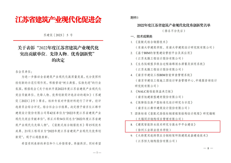 在发展大会上,由徐州工业职业技术学院建筑工程学院申报的“建筑智能防水技术研究与高水平平台建设”获得江苏省建筑产业现代化优秀创新奖。