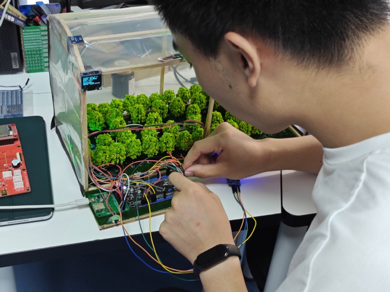 “作为物联网专业学生,我们结合专业知识开发智慧大棚数字控制系统并建立模型,不仅可以减少人力物力,也能提高生产效率推动农业向信息化智能化高速发展。”实践团队长杨天佶在实验室介绍他和团队成员共同设计的智慧大棚,其中搭建了温光水气肥互联系统,能够对不同的环境条件产生相应调节,提高生产效率,充分发挥专业优势,学以致用。