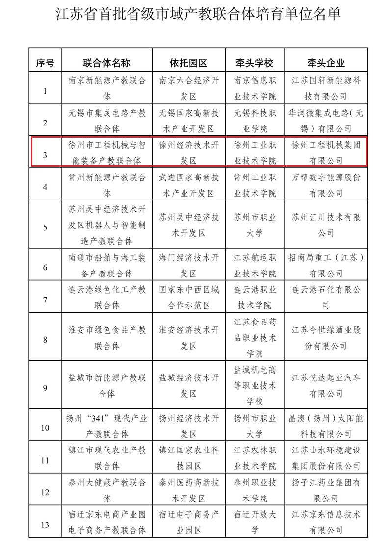 近日,江苏省教育厅发布《省教育厅关于公布江苏省首批市域产教联合体培育单位名单的通知》(苏教职函〔2023〕32号),公布了首批省级市域产教联合体培育单位名单。我校作为牵头学校与徐州经济技术开发区、徐州工程机械集团有限公司联合发起,江苏省机械工业联合会、徐州市发展和改革委员会、江苏师范大学、徐州工程机械研究院、赛摩智能科技集团股份有限公司等近50家单位共同参与组建的“徐州市工程机械与智能装备产教联合体”正式入选为江苏省首批市域产教联合体培育单位。