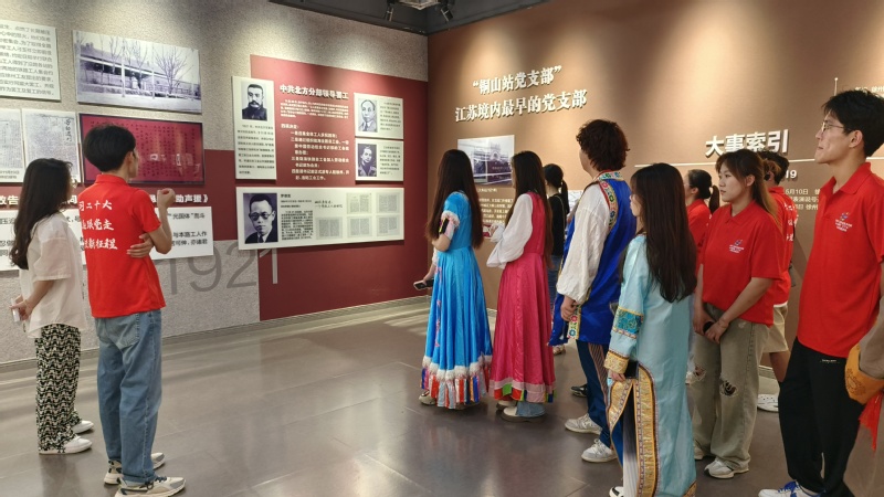 探寻红色之源,共筑民族团结之基。实践团成员第一站来到了江苏境内首个中共党支部成立旧址。在这里,他们了解到从铜山站“八号门”事件,到震惊中外的陇海铁路大罢工,中国共产党初创时期在思想、组织等多个方面就形成的独特政治优势,并深刻感受到中国共产党在复杂多变的社会条件和极端艰苦的战争环境中发展壮大的艰辛历程。全体人员聆听着解说员的讲解,观看历史图片和文献资料,重温了那段波澜壮阔的革命历史,接受着精神洗礼。