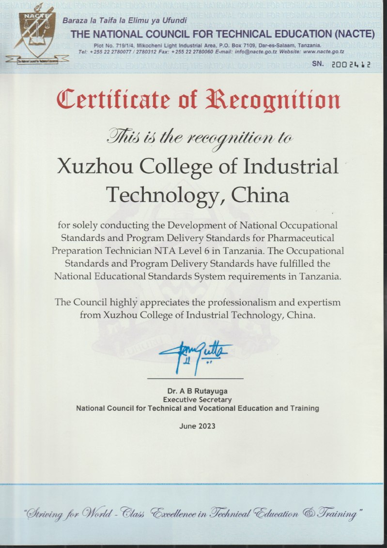 近日,由我校独立开发的药物制剂技术员NTA-6级国家职业标准及配套专业教学标准通过了坦桑尼亚国家职业教育委员会审核和认证,正式纳入坦桑尼亚国家职业教育体系。