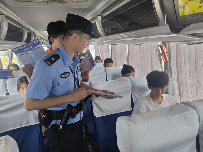 反诈宣传进大巴。“各位乘客大家好,欢迎乘坐“工院号”反诈迎新专列,乘务组全体反诈工作人员将为您提供全方位、无死角反诈宣传服务!”9月9日-10日,来自市公安局鼓楼分局反诈中心和九里派出所的反诈民警们纷纷坐上“工院号”反诈迎新大巴,为刚刚抵徐的新生和家长们宣讲相关防骗知识,形成了一条流动的反诈宣传风景线。民警们紧紧围绕当前大学生易遭受的电信网络诈骗案件类型,通过案例讲解和知识问答等方式和新生们快速熟识,将反诈意识潜移默化地植入学生心间,帮助新生第一时间筑牢反诈防线。