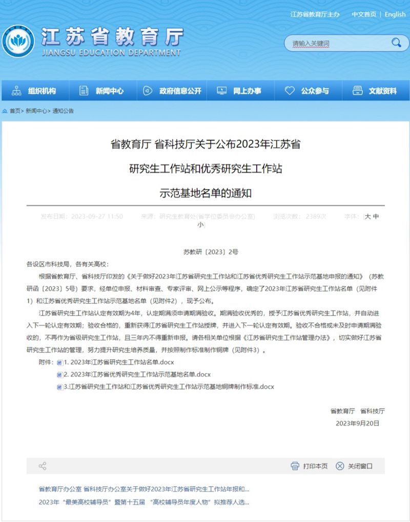 近日,江苏省教育厅、科技厅联合发布《关于公布2023年江苏省研究生工作站和优秀研究生工作站示范基地名单的通知》,我校依托与江苏师范大学的合作,成功获批江苏省研究生工作站。