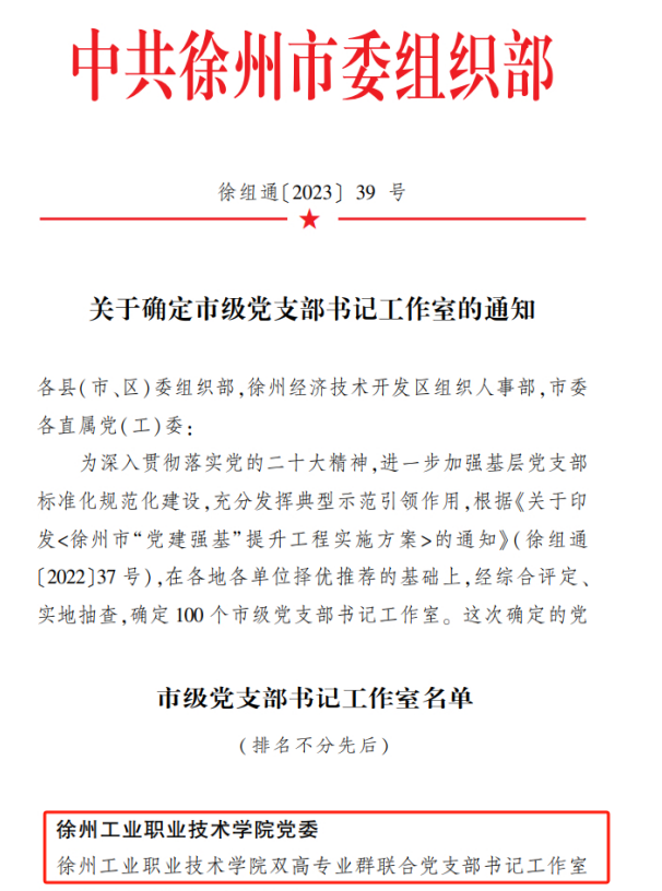 近日,中共徐州市委组织部下发《关于确定市级党支部书记工作室的通知》(徐组通〔2023〕39号),我校双高专业群联合党支部书记工作室获评徐州市党支部书记工作室。