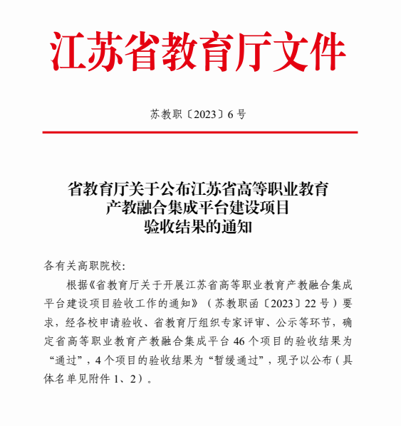 近日,学校在全面梳理、总结产教融合集成平台立项建设以来各方面工作进展和成效的基础上,撰写验收报告并在管理平台填报数据,江苏省教育厅会同省财政厅组成专家组对江苏省高等职业教育产教融合集成平台建设项目进行验收,由我校建设的江苏省工程装备智能制造产教融合集成平台项目顺利通过验收。