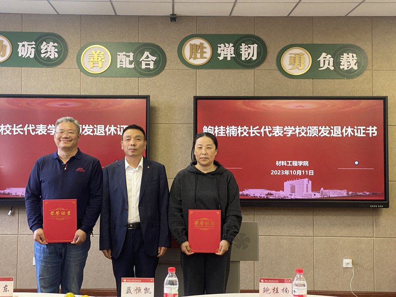 鲍桂楠为聂恒凯、赵晓波老师颁发退休证书,感谢聂恒凯老师在校期间为学校发展建设作出的重要贡献。作为和材料学院共同成长的建设者,聂老师带领材料师生拼搏图强、逐步建立起在行业内的口碑与声望,成为学校与行业企业之间的紧密联系人;感谢赵晓波老师在学院发展的多个重要阶段能勇担重任,用自身严谨的教学态度影响了一批青年教师和优秀学子。两位老师为学院发展奉献了自己的青春和智慧,衷心祝愿两位老师乐享退休生活,同时希望两位老师常回家看看,一起见证学校事业蓬勃发展。