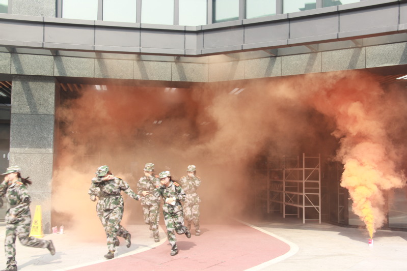 在随后的安全疏散演练中,随着烟雾弹点燃,新生宿舍烟雾弥漫,警笛声响,参加疏散演练的同学捂住口鼻,低头弯腰,按学校应急疏散预案路线,迅速有序地撤离到了安全区域。在工作人员的正确指导下,整个过程紧张又有条不紊。
