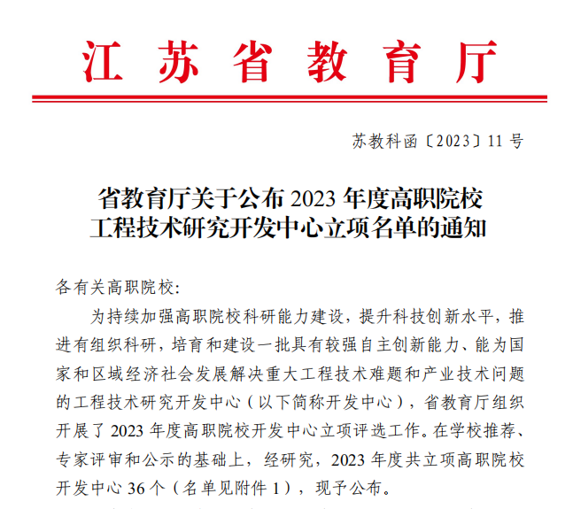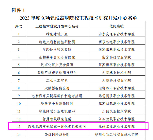 近日,江苏省教育厅发布《关于公布2023年度高职院校工程技术研究开发中心立项名单的通知》(苏教科函〔2023〕11号)文件,全省获批36个工程技术研究开发中心。我校申报的“新能源汽车光储充一体化柔性微电网工程技术研究开发中心”喜获立项建设。