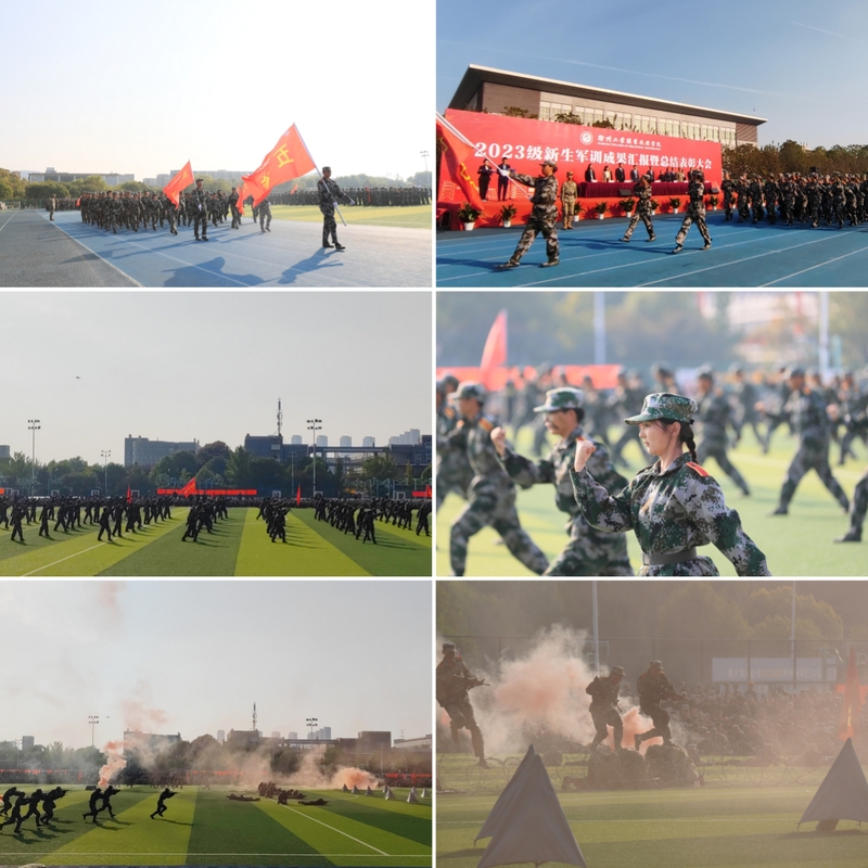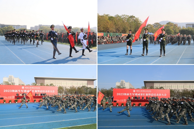 10月21日下午,我校2023级新生军训成果汇报暨总结表彰大会在学校田径场举行。院长鲍桂楠、党委副书记李红、副院长曾凡远、军训团团长陶艮虎,学校各相关部门负责人,各二级学院党总支书记、副书记,全体教官,军训管理辅导员及2023级全体新生参加了大会。大会由党委武装部部长阮浩主持。