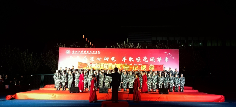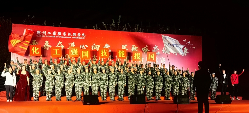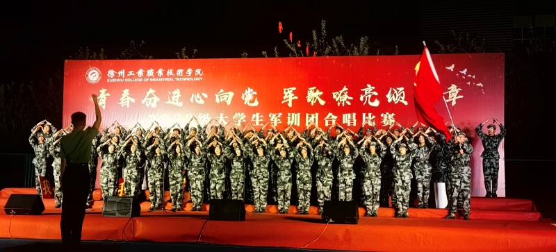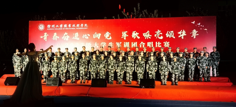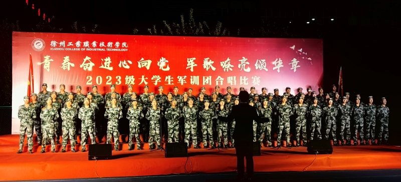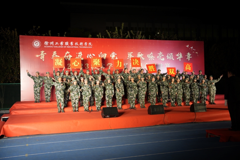 三营二连一曲《徐州工业职业技术学院校歌》深情款款拉开大合唱比赛的序幕。随后,参赛各连身着迷彩、精神抖擞地陆续登场,他们精神饱满、军姿刚毅飒爽,他们饱含爱国爱校之情唱响了《强军战歌》《保卫黄河》《国家》《陆军战歌》《中国军魂》《不忘初心》《英雄赞歌》等一首首爱国强军之歌和校歌,激发了广大学生的爱国爱校情怀,展现了当代大学生的蓬勃朝气和拼搏进取的精神风貌。夜晚的运动场歌声分外嘹亮,看台下观众点亮手机与台上参赛队进行互动,加油助威声连成一片。