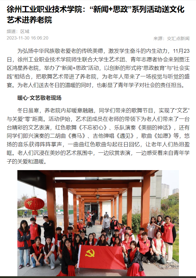 【新华日报•交汇点】徐州工业职业技术学院:“新闻+思政”系列活动送文化艺术进养老院