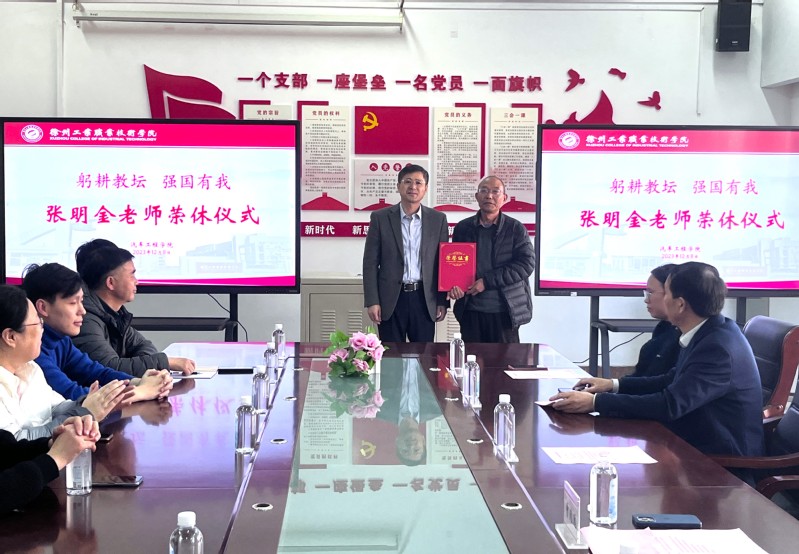 张明金老师发表退休感言,感谢学校领导、同事的关心与关怀,他回忆了自入校以来的奋斗历程,字字句句流露着对离开讲台的不舍,饱含着对徐工院的真挚情感,并祝愿学校未来美好,教师事业顺利,学生学有所成。