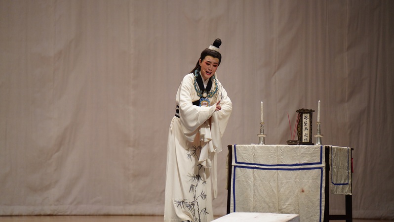 在主持人的剧目导赏后,首先上演了一场精彩的戏曲互动课,几位充满热情的大学生“戏迷”,争相登上舞台,向演员们学习与尝试越剧表演中的身段与唱腔。