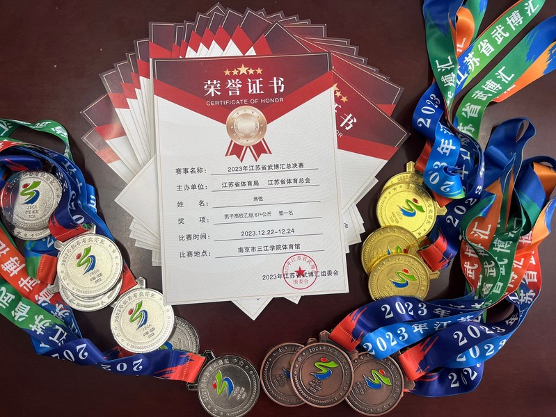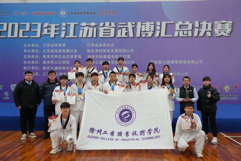 2023年江苏省武博汇总决赛于2023年12月22-24日在南京三江学院举办。本次比赛由江苏省体育局、江苏省体育总会主办,江苏省体育竞赛协会承办。该赛事经过了盱眙、扬州、常熟、丹阳、泰州、南京六站分站赛的激烈角逐,最终我校跆拳道队以优异的成绩在全省4000余名运动员中脱颖而出进入总决赛。本次比赛由李文明和王宇翔两位老师带队,经过三天的激烈角逐,最终获得高校乙组四金七银四铜一个第五的好成绩,我校同时被授予优秀组织奖。