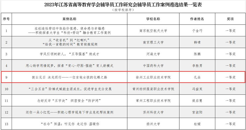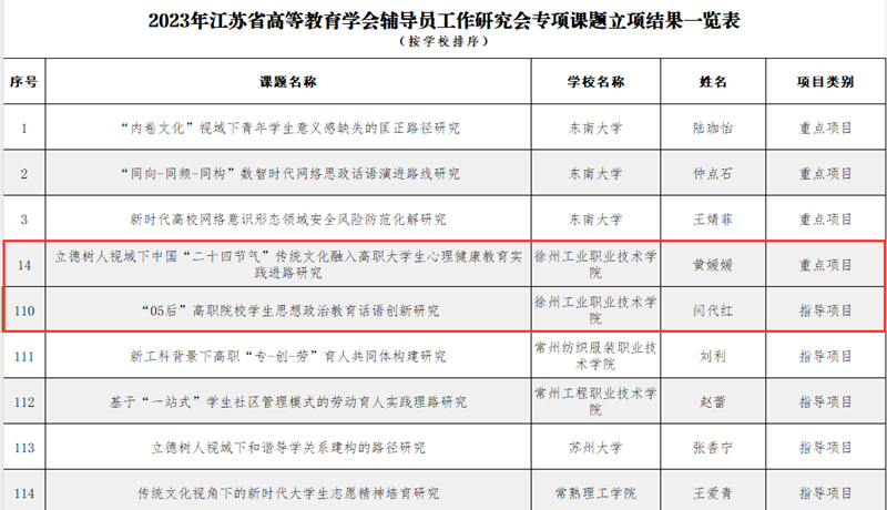 据悉,2023年江苏省高校辅导员工作专项课题、工作案例征集活动共收到专项课题211项、辅导员工作案例177篇,最终设立专项课题重点项目20项、一般项目43项、指导项目85项,遴选出辅导员工作案例一等奖18项、二等奖37项、三等奖53项。