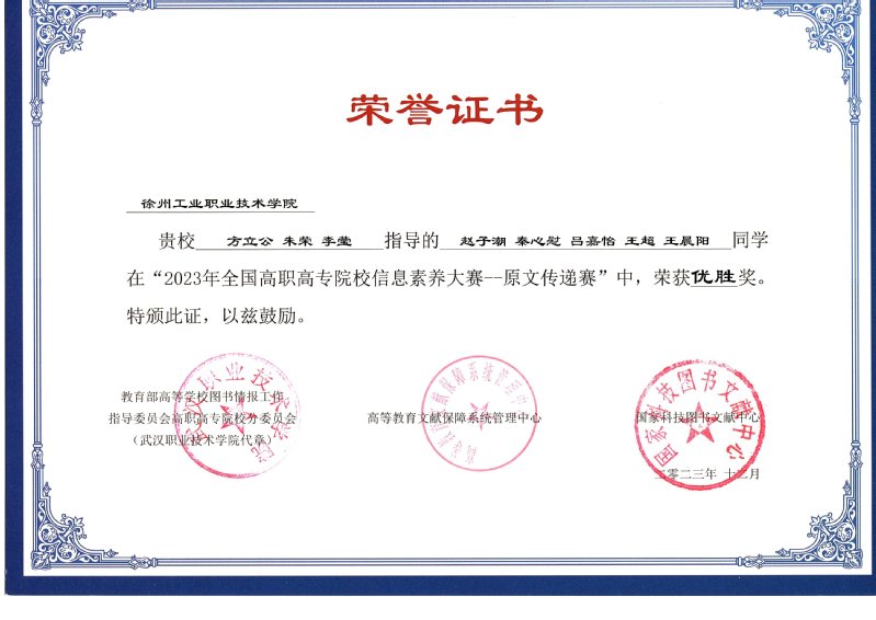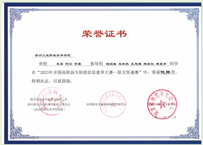 近日,我校在2023年第五届全国高职高专院校信息素养大赛——原文传递赛中,由方立公、李莹、朱荣、陶云四位老师指导的团队获得优胜奖。我校学子杨绍康、庞丛丛、赵子潮等15位同学荣获优胜奖,取得了显著成绩,展现了学子们优秀的信息素养和综合能力。
