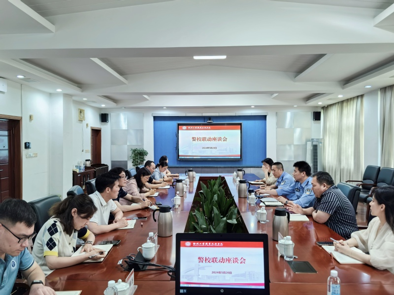 为进一步完善警校联动机制,切实维护校园及周边安全稳定,5月20日下午,我校在行政楼三楼召开警校联动座谈会。九里派出所教导员张兵一行莅临出席,学工处、保卫处及各二级学院学生管理相关负责人参加会议。