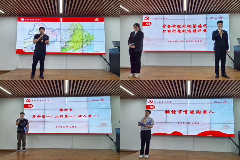 学生党支部党员教师王军雨给大家分享了宁可讨米讨饭,忍饥挨冻,也要坚守着廉洁纪律的刘启耀的光辉事迹;赵鹏飞带领大家共同学习了“两袖清风做赤子”的徐特立先生的崇高精神;李春晓老师则带来了辽沈战役期间解放军战士“不拿群众一针一线”,始终心怀人民的感人事迹;两位入党积极分子刘恩泽和聂嘉琦则带来了即使在身陷囹圄、面临生死考验也始终坚守党的政治纪律的方志敏的事迹。