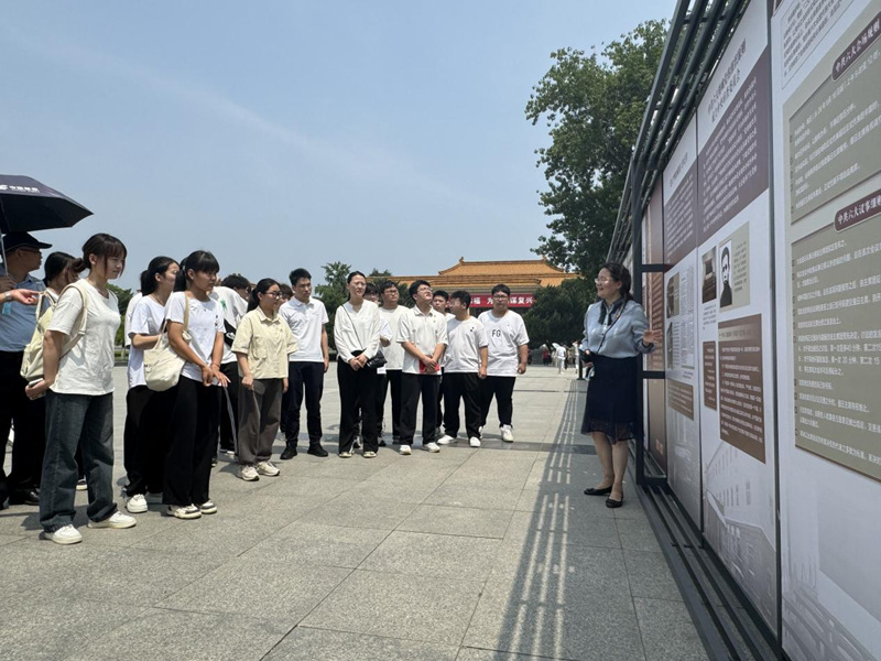 王敏书记带领同学们绕淮海战役纪念塔一周表达对烈士的纪念,同时在此过程中,她为同学们细致地讲述塔身图案的故事,依次为同学们讲解现场壁画、伟人题词、烈士名录,并让同学们思考为什么淮海战役被称为“人民的胜利”的原因。