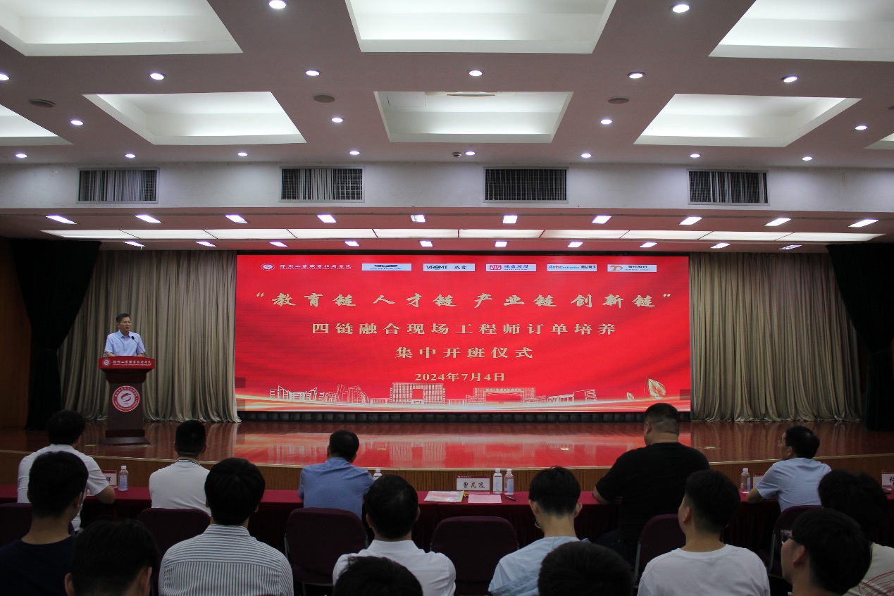 7月4日,汽车工程学院在图书馆报告厅举行“教育链 人才链 产业链 创新链”四链融合现场工程师订单培养集中开班仪式暨现场工程师培养集中签约仪式,我校副校长曾凡远、常州澳弘电子股份有限公司副总经理杨文胜、威睿电动汽车技术有限公司人力资源总监王宜恒、鹏鼎控股集团人资部副理靳长超、吉利汽车人力资源经理张炎、无锡晋拓汽车部件有限公司人力资源经理肖喆等出席仪式,汽车工程学院相关负责同志及教师代表、22级订单班学生参加仪式。仪式由汽车工程学院党总支副书记龚魏魏主持。
