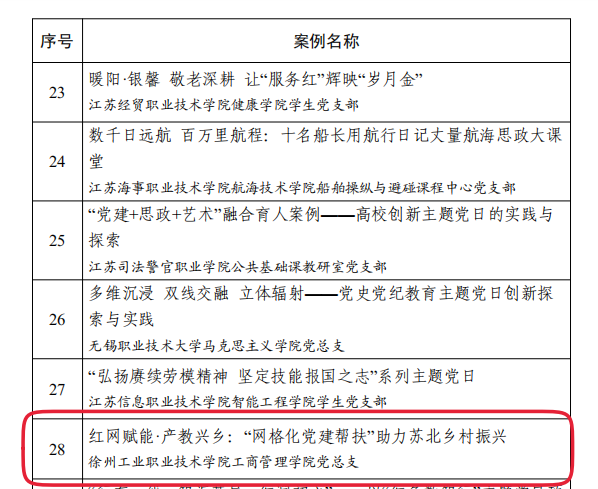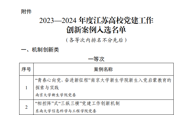 近日,江苏省委教育工委公布了2023-2024年度江苏高校党建工作创新案例名单,我校推荐申报的2项案例均荣获一等次,是全省少数获得双一等次的高职院校之一,充分体现了学校党建工作的创新性与实践成效。