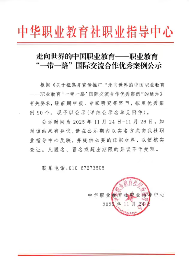 近日,中华职业教育社职业指导中心发布了《走向世界的中国职业教育——职业教育“一带一路”国际交流合作优秀案例公示》。我校申报的案例《教随产出 校企同行:打造跨境技能人才培养共同体的徐工实践》成功入选,充分彰显了学校在服务国家战略、探索职业教育国际化新模式方面取得的突出成果。
