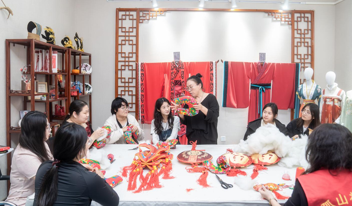 学校打破传统学科边界,以"情境创设+数字赋能+艺术疗愈"路径实现美育深度融合。在心理健康教育中创新融入艺术疗愈元素,通过心理情景剧创作、情绪管理工作坊等载体,引导学生在艺术表达中实现自我认知与压力疏解。构建传统文化传承创新体系,依托九里书院、中华优秀传统文化传习所、美育工作坊等校园文化阵地,将徐州汉代纹样设计、香包制作、书画体验、茶艺体验、中医药市集等多个体验课程与学生日常活动有机衔接,使学生在非遗创新工坊中既锤炼工匠精神,又提升审美素养,形成德技并进的育人闭环。