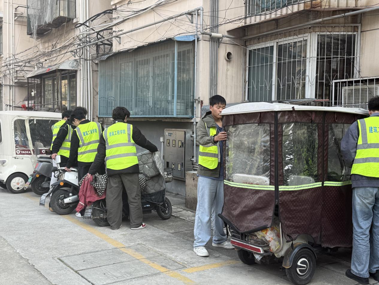 赴九里社区开展环境整治,助力人居环境提质增效。学院组织志愿者前往九里社区,开展“学雷锋践初心,净环境美家园”实践志愿服务。活动现场,志愿者们分工明确、协作高效,重点清理楼道卫生死角、楼栋周边堆积杂物及生活垃圾,细致铲除墙面违规小广告,有效改善了社区环境卫生面貌。在社区垃圾分类投放点,志愿者们耐心引导居民规范分类投放,细致普及垃圾分类知识,积极倡导绿色低碳、文明健康的生活方式;同时,对社区内乱停乱放的非机动车进行规整,及时消除通行安全隐患,切实维护了社区公共秩序。青年学子们脚踏实地地付出、认真负责的态度,赢得了社区居民的广泛好评与一致认可。